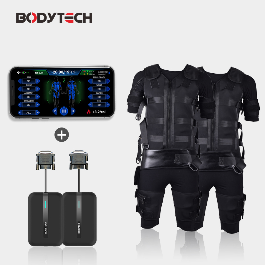 • The EMS workout suit contains 20 electrodes, covering 90% of the muscles of the body.