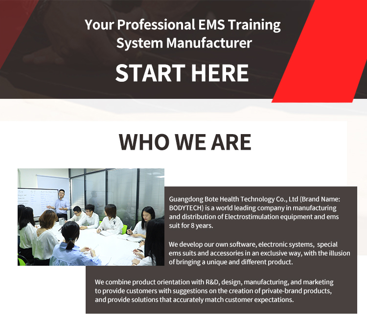 EMS (electric muscle stimulation) training is a total body electrode workout that uses electrical pulses to stimulate muscle contraction. Its basic principle is to control muscle contraction and relaxation by simulating bio-electrical signals sent by the brain.